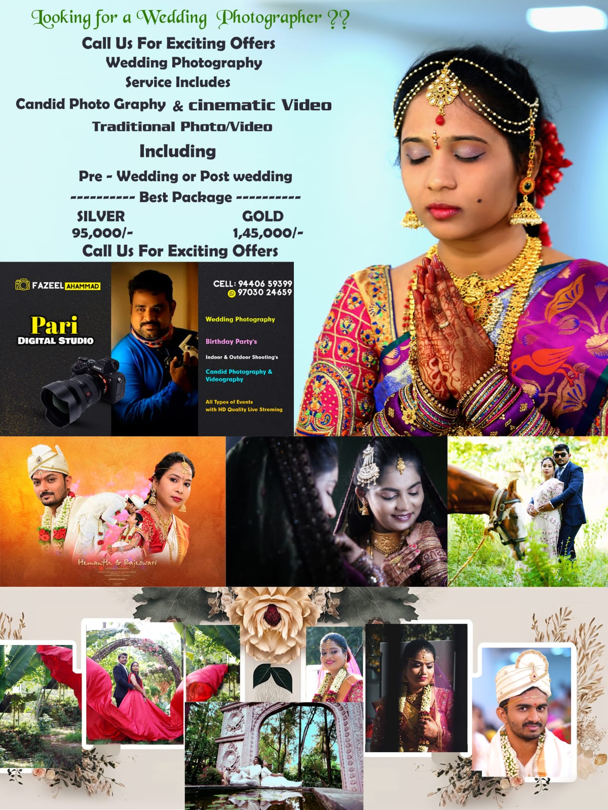 Pari Digital Studio Anantapur is a trusted name in professional photography and videography, known for capturing life’s precious moments with creativity and precision. With a commitment to excellence, they deliver stunning visuals that tell your unique story. Services Offered: 1. Wedding Photography 2. Pre-Wedding Shoots 3. Birthday Party 4. Candid Photography