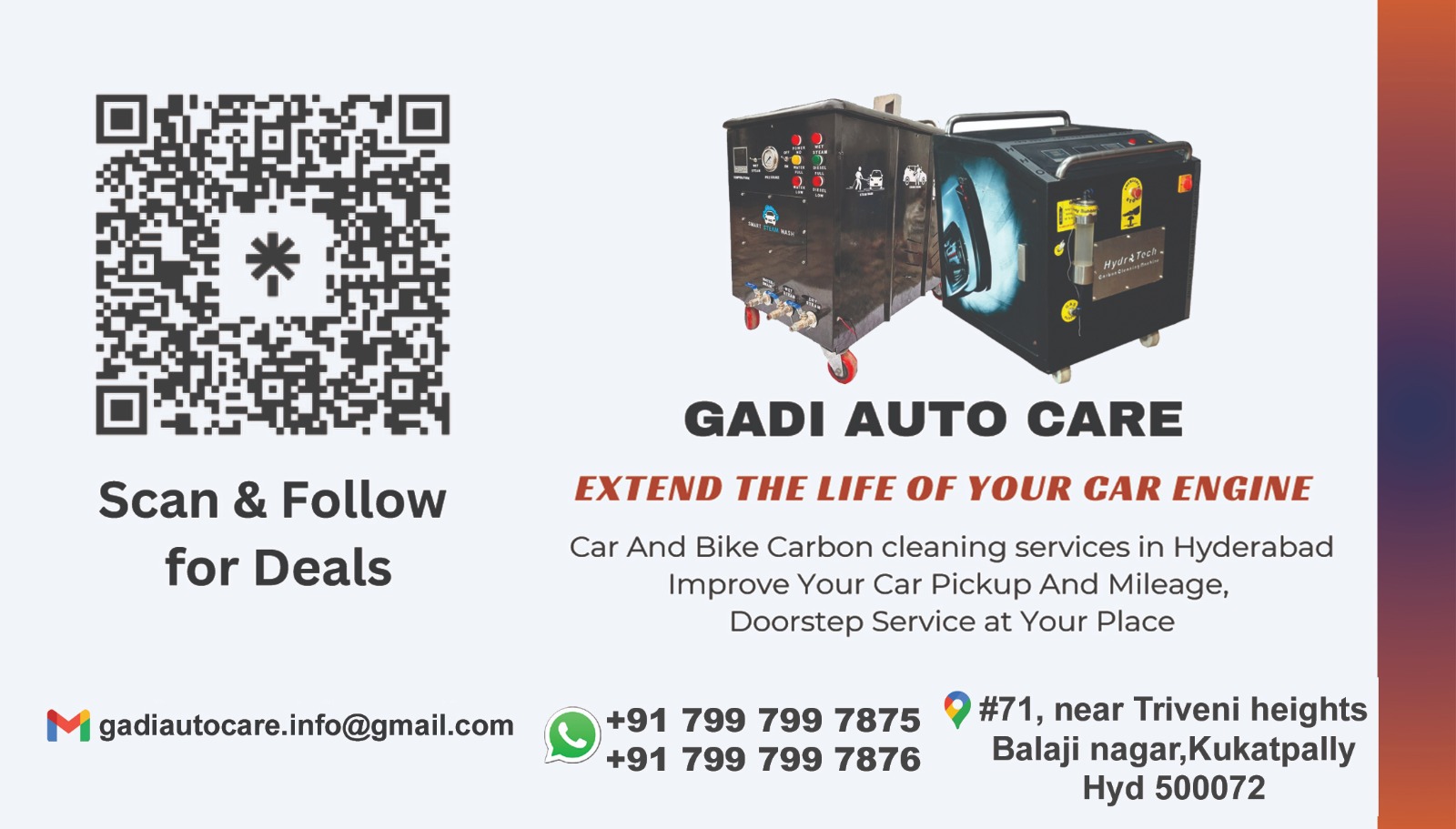 Gadi Auto Care Hyderabad DESCRIPTION : We offer as these services 1.saves fuel 2.Increase mileage & pick up 3.Increase engine life 4.Decrease Noise & Vibration 5.Decrease Black Smoke& knocking 6.Decrease engine overheat 7.Decrease harmful emissions etc.
