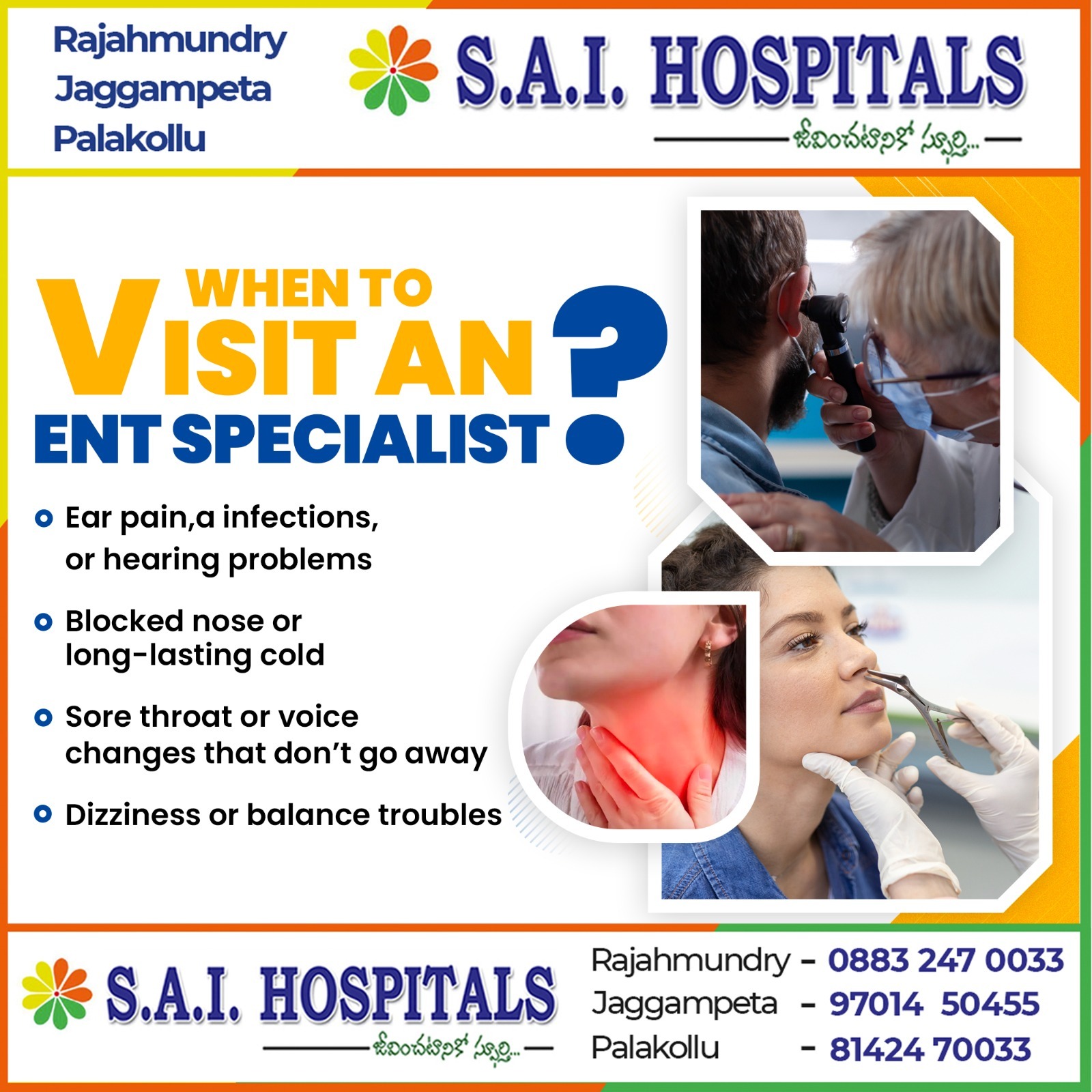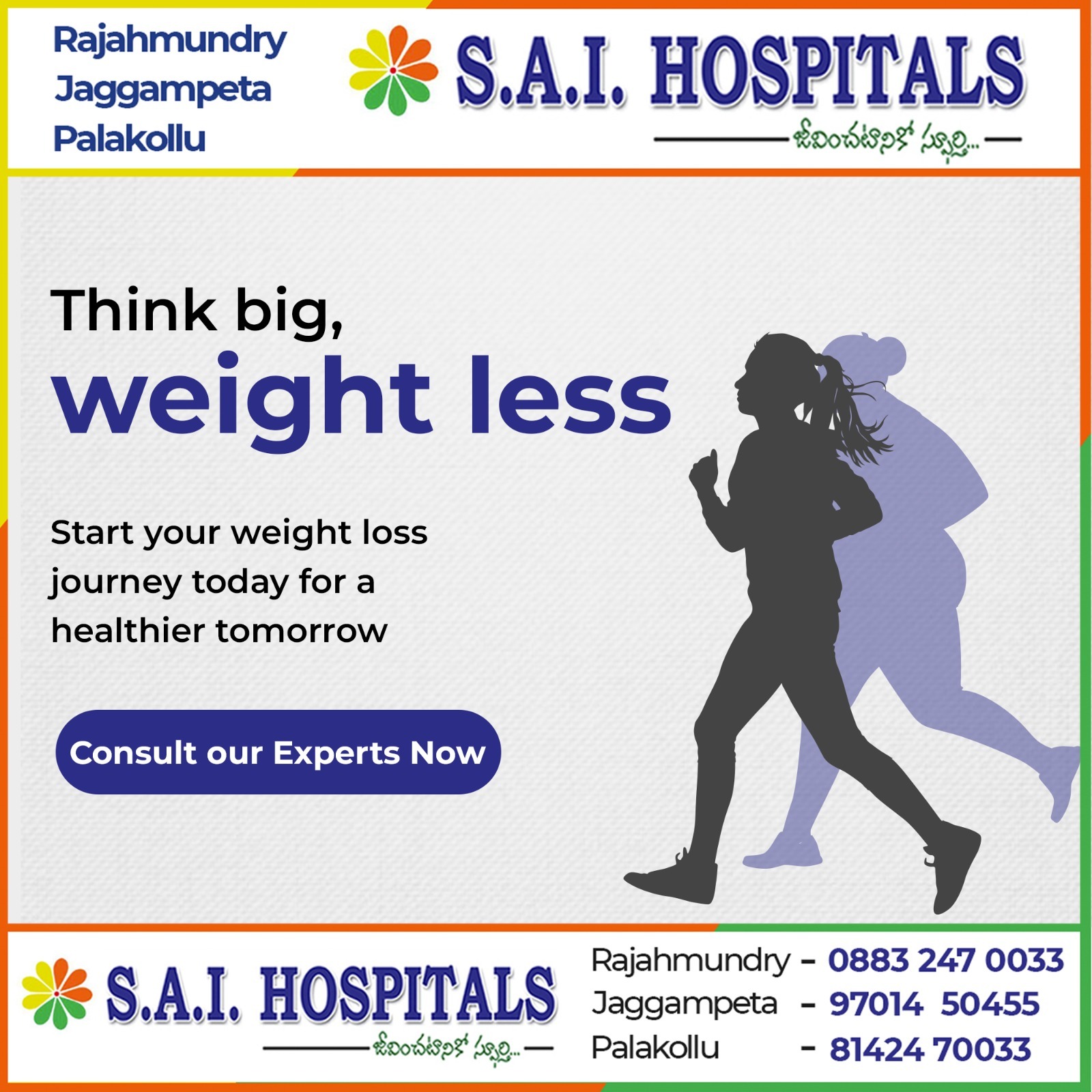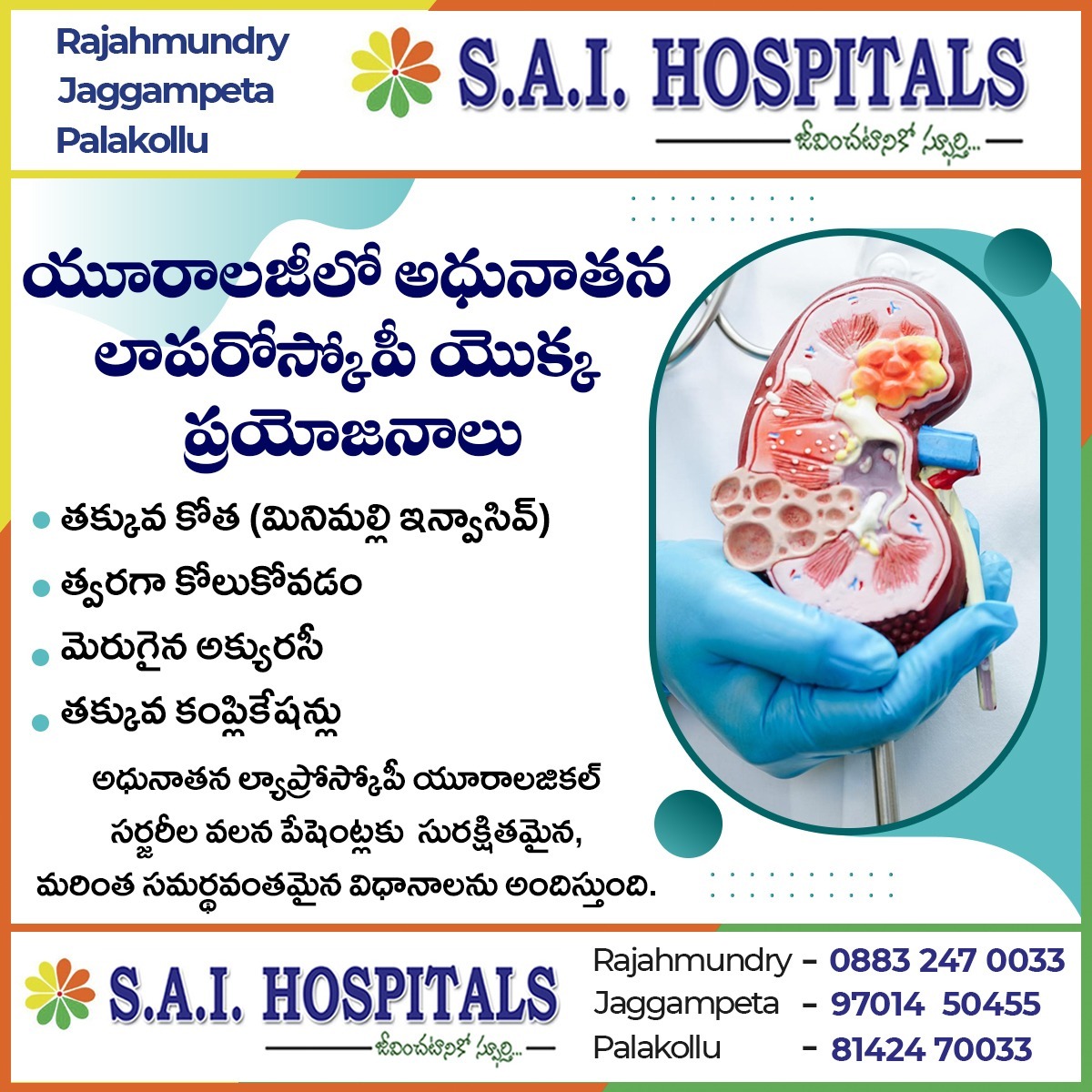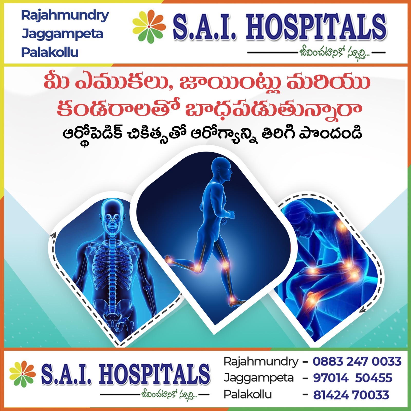 S.A.I hospital was started in the year 2005 by Dr. Vijay Kumar Kurukuri an orthopedic surgeon as Subrahmanyam Ananthalaxmi Institute of Orthopedics & Trauma with bed strength of 3. with subsequent expansions, Now the hospital grew into a Multi Speciality Hospital with bed strength of 150. Services in S.A.I Hospitals Orthopedics, Urology, Neurology, E.N.T, CRITICAL CARE, General Medicine, Bariatic Surgery, Cardiology, Physiotherapy, Cardiothoracic Surgery, Gastroenterology, Vascular Surgery, DENTAL, Dialysis, Ultra Sound, CT SCAN, Laboratory, Digital X-Ray, Operation Theatre with Laminar Air Flow, Joint Replacement and Arthroscopic, Laproscopic Surgery,