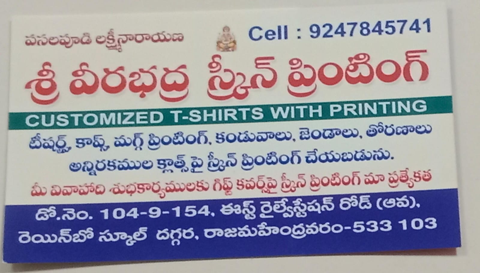 Sri Veerabadhra Screen Printing Rajahmundry Welcome to Sri Veerabadhra Screen Printing, your one-stop solution for customized screen printing needs in Rajahmundry! With years of expertise, we specialize in bringing your designs to life on a wide range of products. Whether it's for personal use, corporate branding, or promotional events, we deliver high-quality prints tailored to your needs. Tshirts, Caps, Mug Printing, Scarves, Flags, Arches